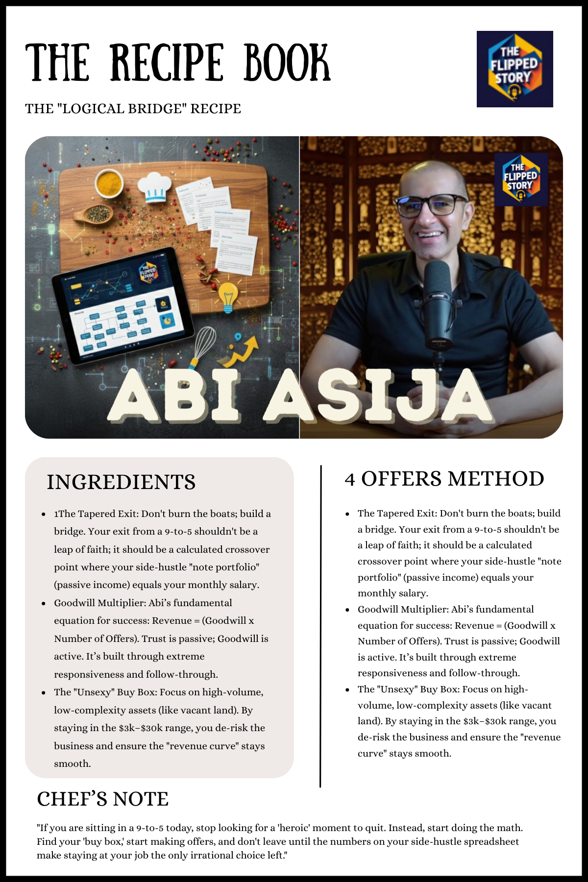 He shared a fundamental equation that every business owner needs to hear: Revenue = (Goodwill x Number of Offers). By systematizing responsiveness and empathy, Abi turned land flipping into a repeatable, reliable machine that serves people as much as it moves property.